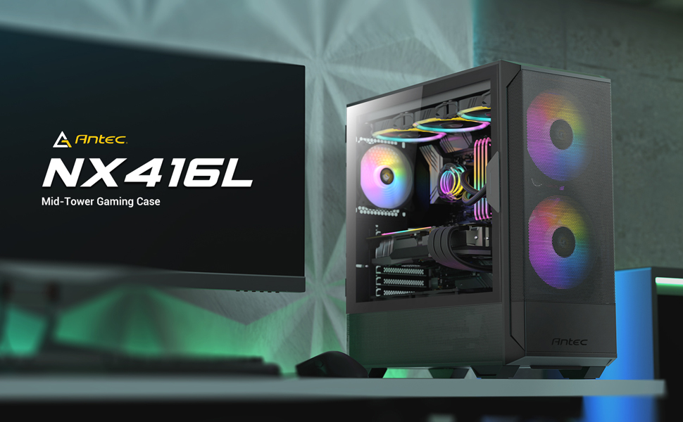 ANTEC NX416L, High Airflow Mesh Front Panel, 2 x 160mm & 1 x 120mm ARGB Fans Included, Type-C, Tempered Glass Hinge Side Panel, Up to 11 Fans, 360mm Radiator Support, Mid-Tower ATX Gaming Case