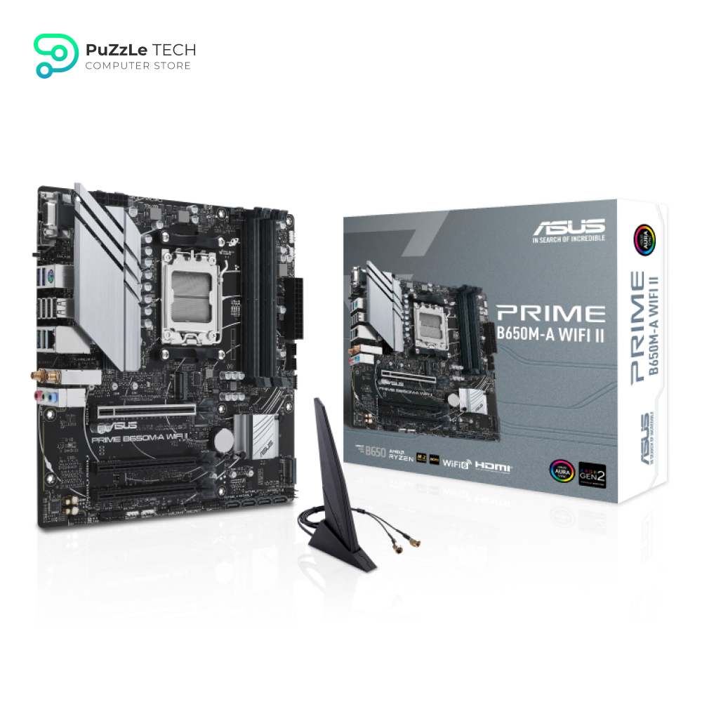 The PRIME B650M-A WIFI II delivers robust AM5 support for Ryzen 7000/8000 series CPUs, featuring 6+2+1 power stages, DDR5 6400MHz+(OC), and WiFi 6 connectivity. With dual PCIe 4.0 M.2 slots, 2.5Gb Ethernet, and comprehensive cooling, this micro-ATX motherboard balances performance and value for productivity and gaming builds.