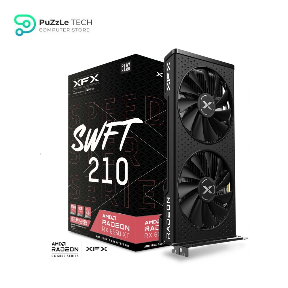 The XFX SPEEDSTER SWFT 210 RX 6650 XT unleashes high-fidelity 1080p gaming, powered by the breakthrough AMD RDNA 2 architecture. Equipped with 8GB of high-speed GDDR6 memory and an efficient dual-fan SWFT 210 cooling solution, this card delivers incredible performance, lifelike visuals, and elevated frame rates for the latest AAA titles.